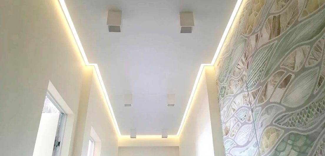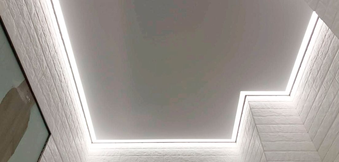Брус с подсветкой - это встроенная в натяжной потолок подсветка по периметру помещения или вдоль определенных стен. Подсветка располагается в одной плоскости с натяжным потолком.