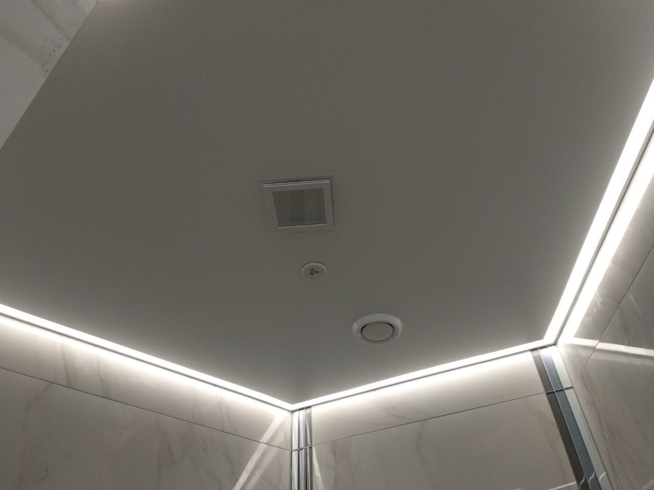 Примыкание с стенам осуществляется с использованием технической вставкой, экраном для подсветки служит полотно.