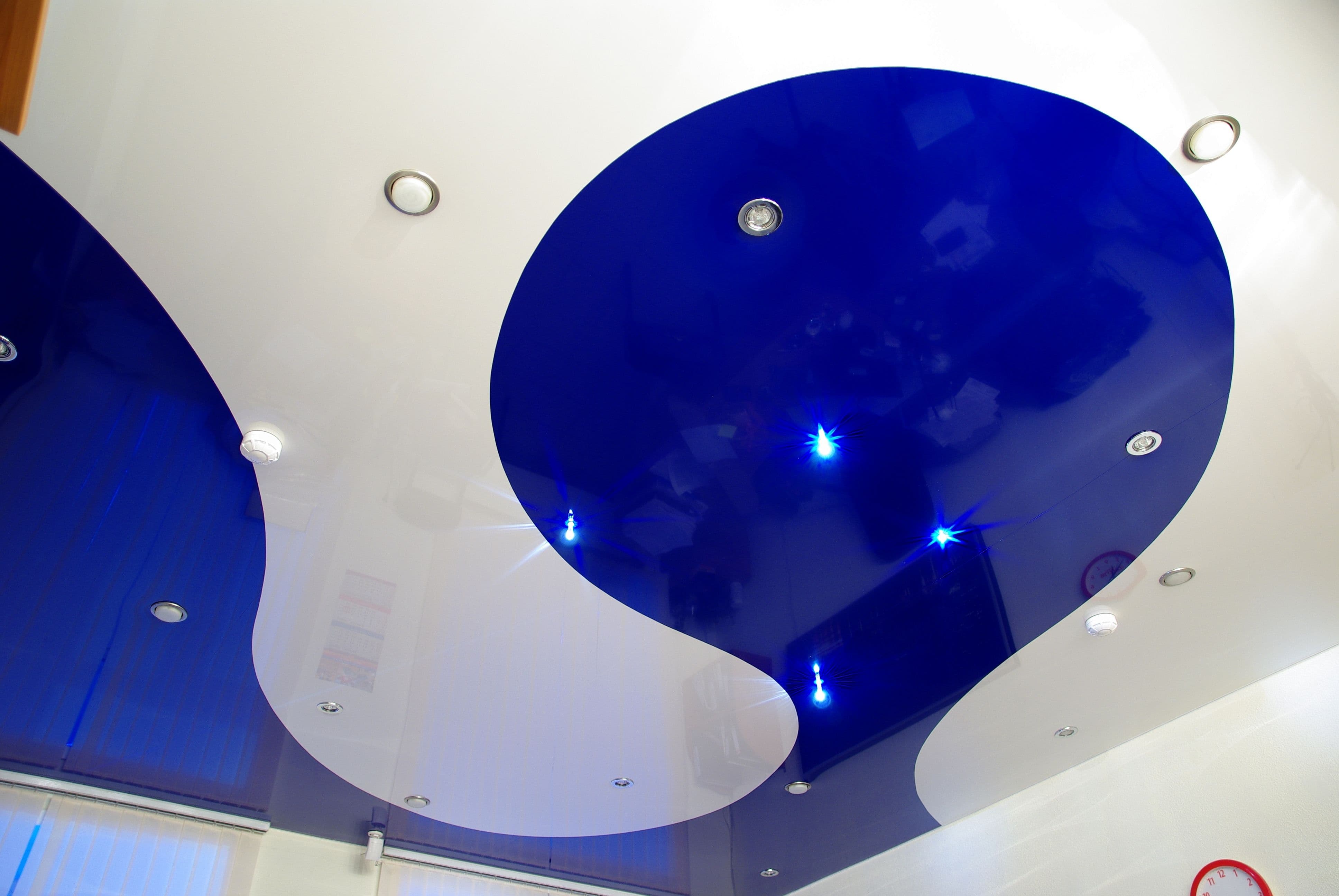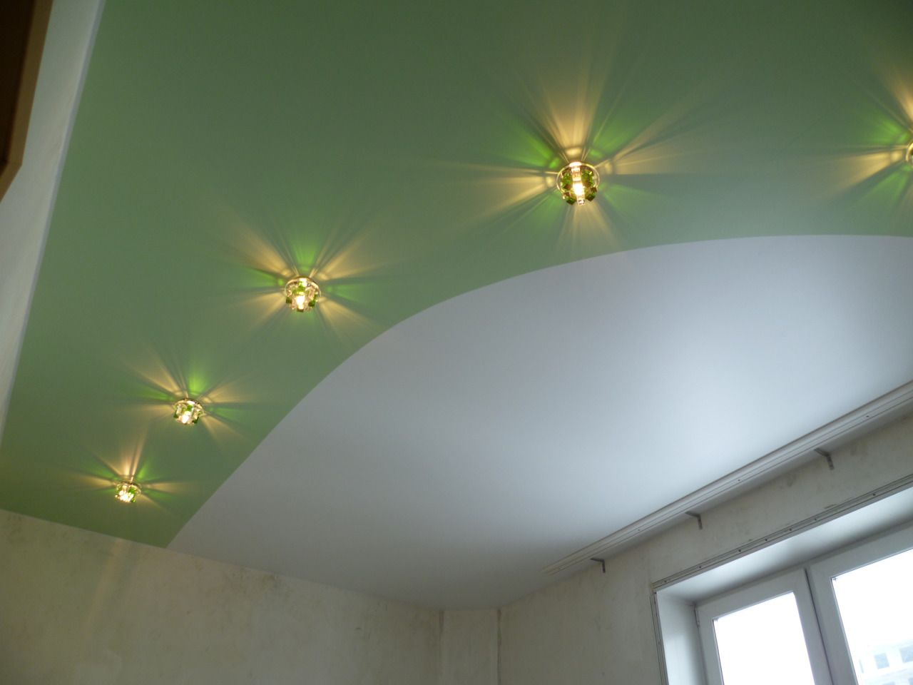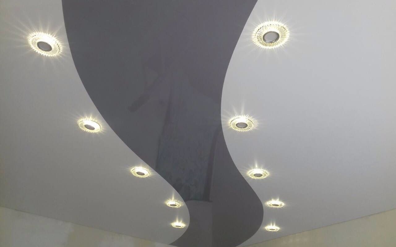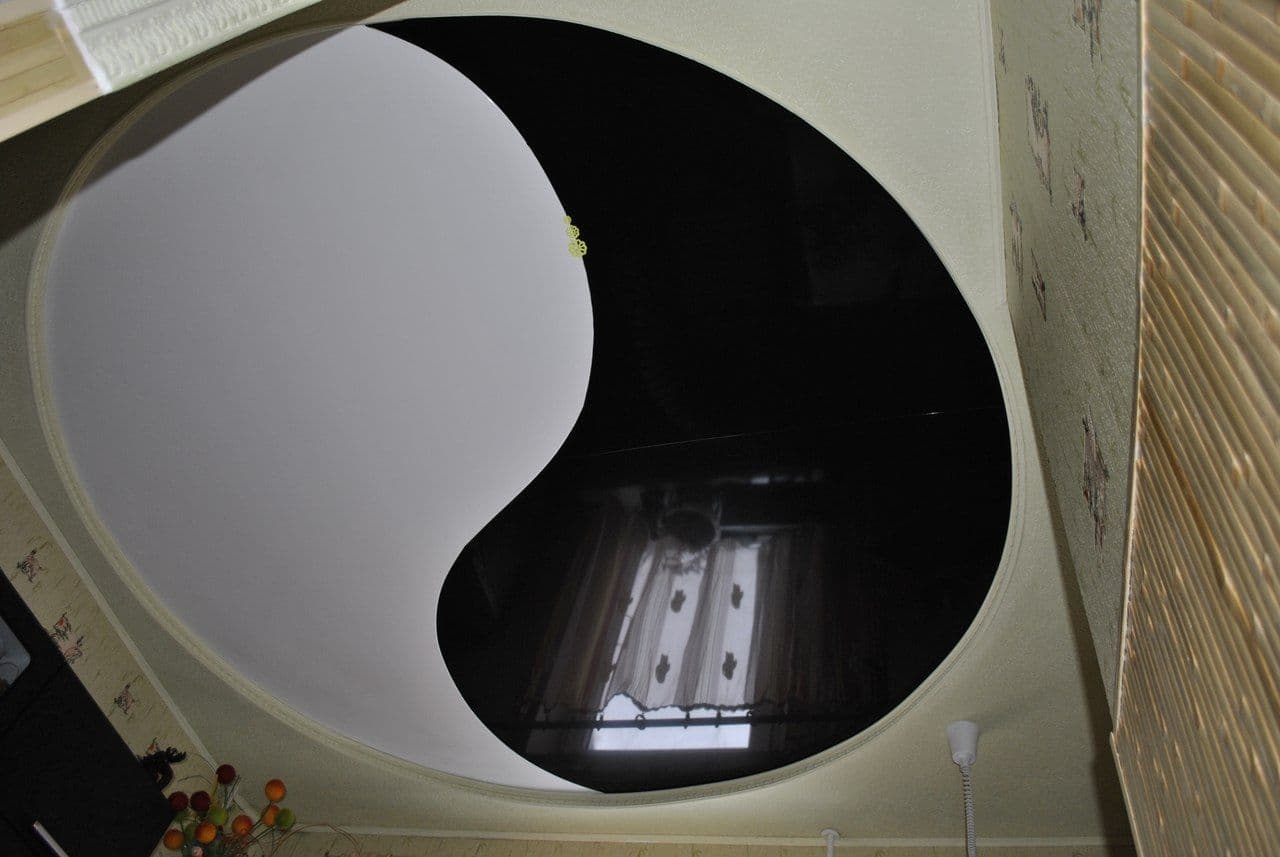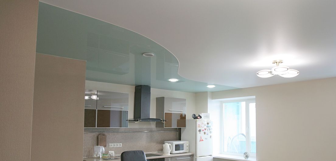 Такие потолки представляют собой отрезы, которые спаиваются на производстве. Получается единая плёнка, но с двумя разными цветами. Потолок натягивают в один уровень.
