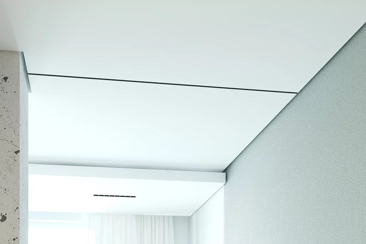 Разделительный профиль Flexy EURO 04 с теневым зазором для натяжных потолков с гарпунной системой крепления полотна. Используется для наклонных натяжных потолков на мансардах либо для разделения поверхности полотна на несколько сегментов без использования разделительной вставки. Теневой зазор: 7,7 мм.